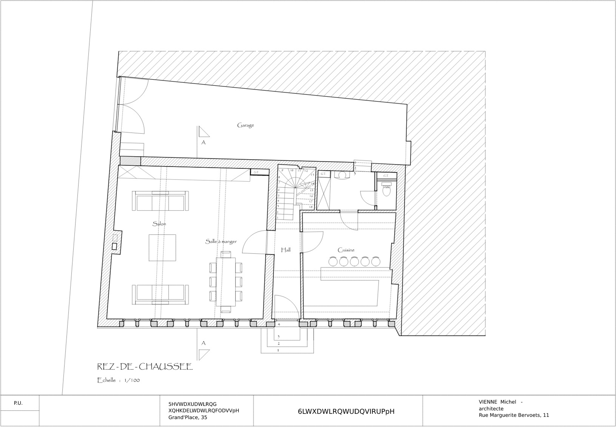 Rez-de-chaussée : Hall d'entrée de +/- 8,4 m², cuisine de +/- 20 m², living de +/- 48 m², buanderie de +/- 3 m², WC de 1 m², garage de +/- 40 m².